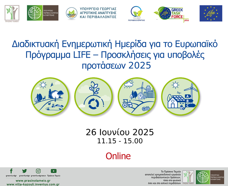 Within the framework of the responsibilities of the National Contact Points of the LIFE Programme in Greece and Cyprus, and of the LIFE Capacity Building Project 101101858 – Greek LIFE Task Force plus (LIFE21-CAP-EL-GRLTF plus), the Green Fund, the Ministry of Environment and Energy of Greece, and the Ministry of Agriculture, Rural Development and Environment of Cyprus, in cooperation with the European Climate, Infrastructure and Environment Executive Agency (CINEA), are organizing and cordially inviting you to the LIFE Info Day – 2025 Call for Proposals, on Thursday, 26 June 2025, from 11:15 a.m. to 3:10 p.m.